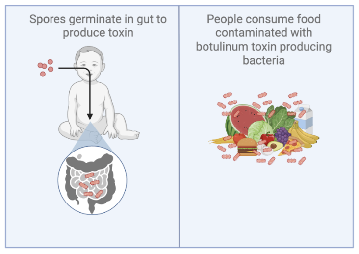 Figure 1: Common ways people get botulism. (LEFT) Bacterial spores—small, non-reproducing bacterial structures—germinate in the gut after being ingested and the microbes produce botulinum toxin. More common in babies. (RIGHT) Ingestion of botulinum toxin in contaminated foods (usually improperly canned food). This is more common in adults.