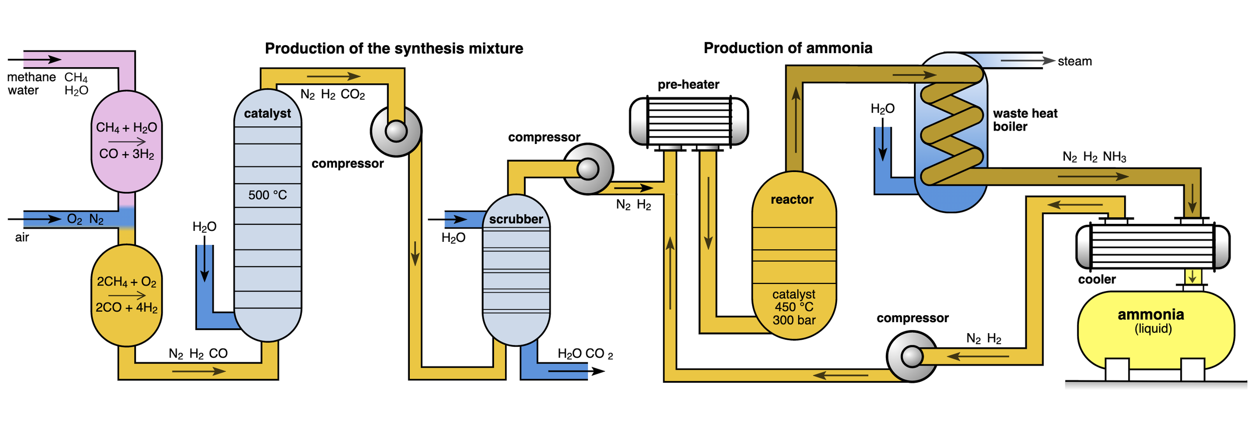 Diagram of Haber-Bosch industrial process to produce ammonia for use in fertilizers - estimated that as much as 80% of the nitrogen in your body comes from this process! Source: Wikimedia Commons.