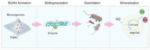 Figure 1 (above). The process of microbial depolymerization and degradation. In the first phase, microorganisms with plastic degrading abilities attach to the material’s surface to form sheets, or biofilms. Then, the organisms produce enzymes to break down the materials into smaller units, or monomers (described further below). The microorganisms can then use (or “assimilate”) the broken down material in their own metabolism, making products such as methane and carbon dioxide (“mineralization”). Image and description summarized from Lu, Li, Zhao and Shao, 2024.