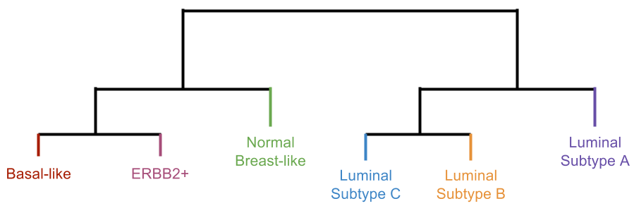 The non-luminal branch further broke down into three groups: basal-like subtype, ERBB2 subtype, and normal breast-like group. For example, the ERBB2 subtype had a clear overexpression of the growth receptor, ERBB2, which lead to its naming. The luminal branch broke down into three groups: luminal subtype A, luminal subtype B, and luminal subtype C.